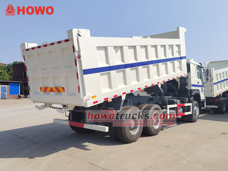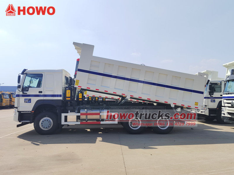 Самосвал HOWO 6x4, модифицированный на базе шасси HOWO HW76, имеет колесную базу 3200+1400 мм, оснащен дизельным двигателем WP10.380E22 мощностью 380 л.с., трансмиссией HW19710 (10 передач переднего хода, 2 передачи заднего хода) и самосвальным кузовом из углеродистой стали толщиной боковин 8 мм и днища 10 мм, размерами 5200x2300x1400 мм. Передний верхний подъем обеспечивает стабильный подъем, чистую и быструю разгрузку, задние двери открываются, а управление осуществляется с помощью регулирующего клапана со стороны водителя, что упрощает эксплуатацию.