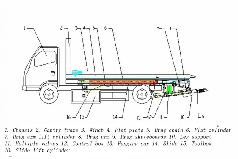 ●Надстройка эвакуатора с платформой состоит, главным образом, из опорной стрелы, платформы, лебедки, гидравлической системы, вспомогательных опор и устройств управления.