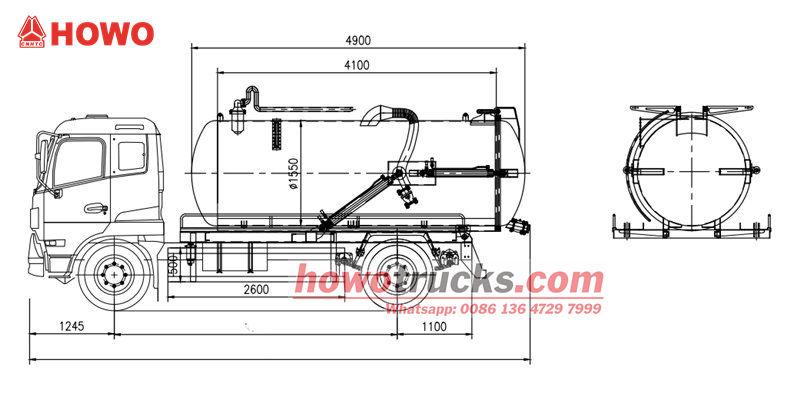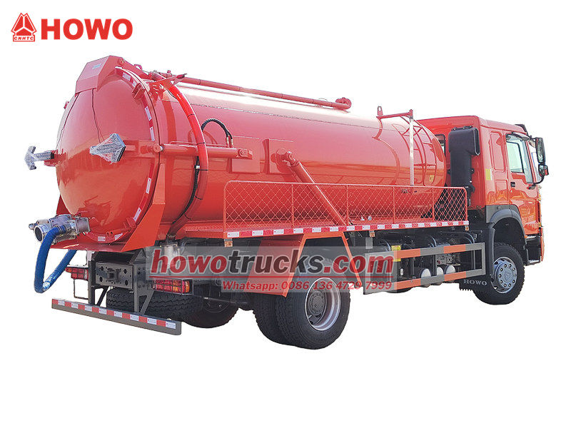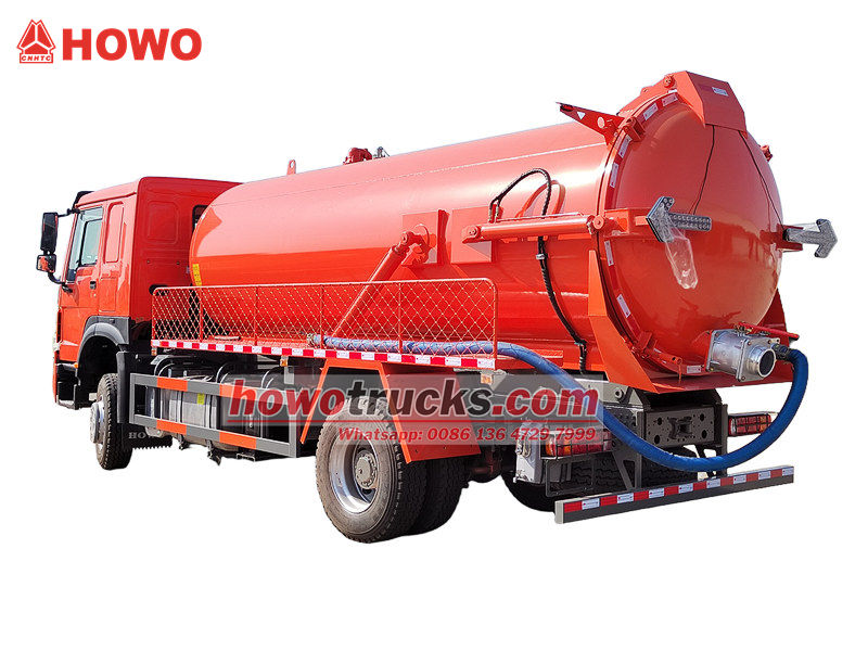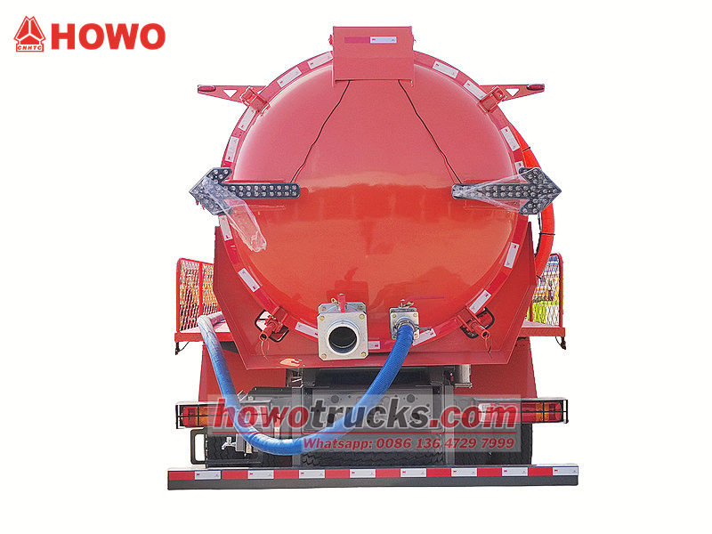●Автовышка для откачки сточных вод Howo использует вакуумный насос для создания высокого отрицательного давления, формируя вакуум внутри резервуара.