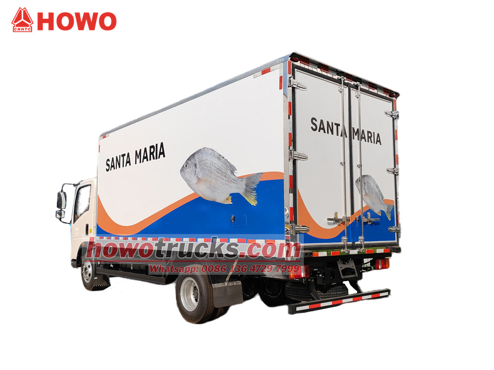 Рефрижераторный грузовик HOWO 4x2 построен на шасси легкого грузовика HOWO с колесной базой 3360 мм. Оснащен двигателем Cummins ISF3.8s4R154 мощностью 154 лошадиные силы и 6-ступенчатой коробкой передач WLY6TS55. Верхний рефрижераторный кузов имеет размеры 4200 мм.×2200×Кузов имеет ширину 2050 мм и изготовлен из стекловолокна, композитного материала FRP + пенополиуретан + панель FRP толщиной 105 мм, полностью закрытой сэндвич-панели, правосторонней двери, полноразмерной двойной задней двери, нескользящего и износостойкого пола, а также оснащен холодильной установкой HX-580. Кузов вмещает 5 тонн груза и в основном используется для транспортировки морепродуктов в условиях холодовой цепи.