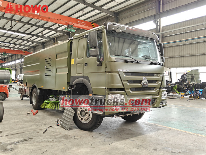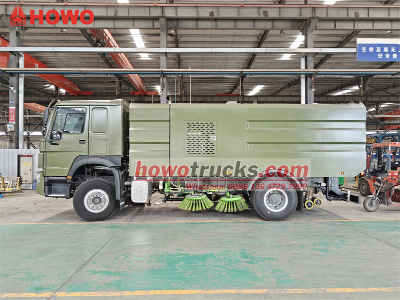 Подметальная машина HOWO объемом 12 куб. м модифицирована на базе шасси HOWO HW76. Она имеет колесную базу 4600 мм и оснащена двигателем Weichai WP10.300E22, коробкой передач Sinotruk HW19710, баком для воды из углеродистой стали объемом 4000 л, внутренним и внешним мусорными контейнерами из нержавеющей стали объемом 8000 л, а также вспомогательным двигателем Dongfeng Cummins B140 33. Машина также оборудована четырьмя подметальными щетками и присоской, воздуходувкой Weiye, немецким плунжерным насосом высокого давления PINFL PF36 (1150 об/мин) и водяным насосом низкого давления Hangzhou Weilong 60/90 (60 м³).³/ч). Перед кабиной расположены несколько промывочных форсунок, а перед щеткой для подметания — распылительная форсунка. Ширина промывки водой под высоким давлением составляет 2,5 м, ширина подметания щеткой — 3,5 м, а максимальная производительность подметания — 60 000 м².³/ч. Скорость подметания составляет 3-20 км/ч. Управление машиной осуществляется электронным блоком управления в кабине и блоком управления работой на насосе.