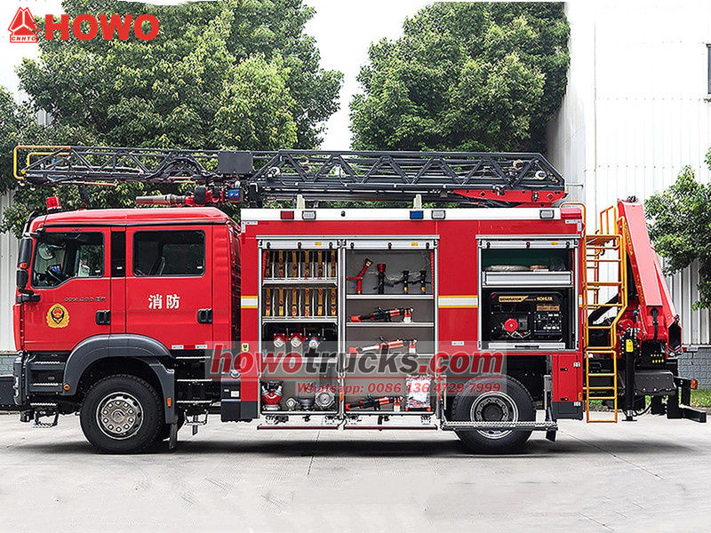 13000Он Пожарно-спасательный автомобиль Howo с лестничной платформой Это специализированный автомобиль, разработанный специально для тушения пожаров и спасательных операций. Он построен на шасси серии Howo TX, оснащен мощным двигателем мощностью 400 л.с. и обладает превосходной маневренностью. Грузовик окрашен в ярко-красный цвет пожарной машины и оборудован несколькими отсеками для хранения различного спасательного оборудования.