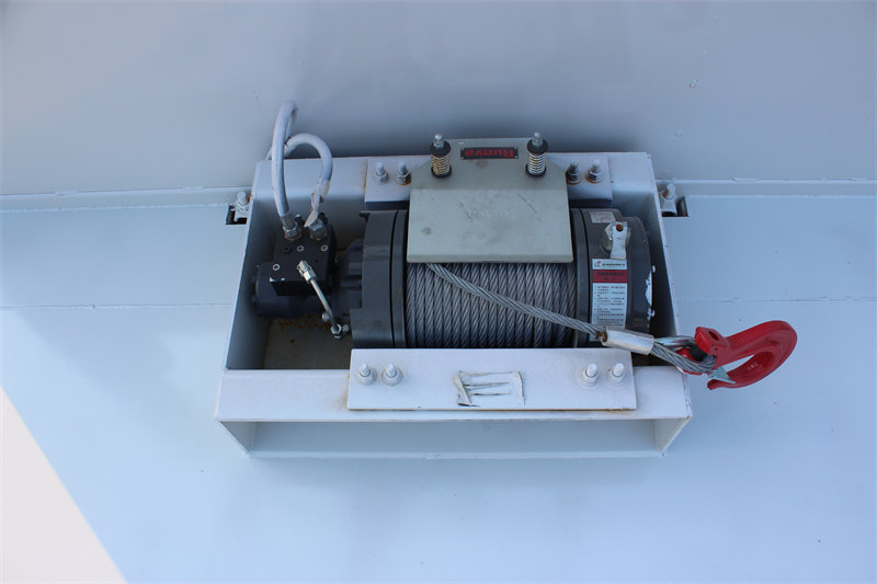 4. Эффективная самозагрузка и разгрузка: Оснащен 8-тонной гидравлической лебедкой, 2-метровой гидравлической рампой и 25-тонной передней гидравлической опорной стойкой, что позволяет осуществлять независимую погрузку и разгрузку оборудования без использования дополнительной техники.