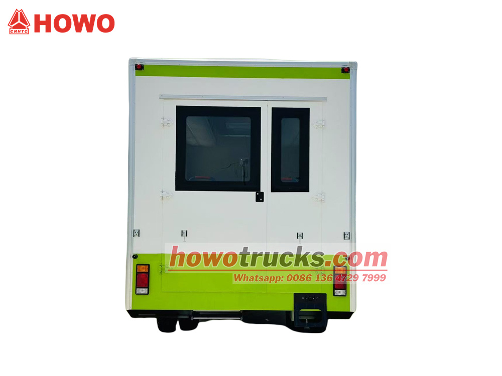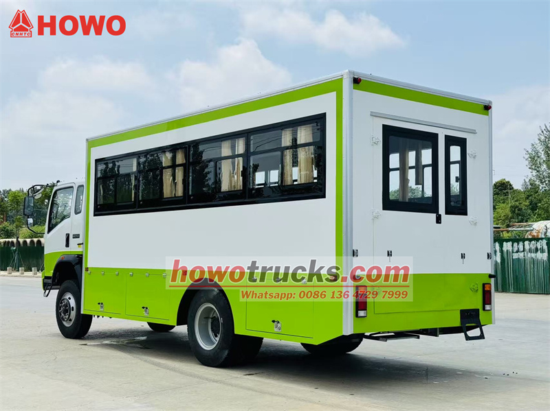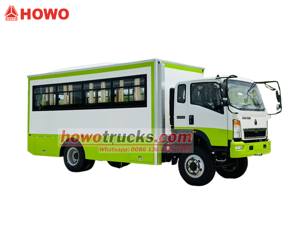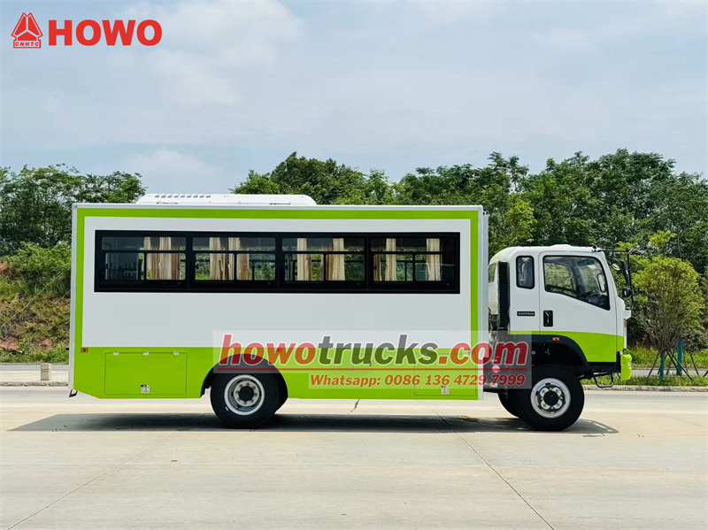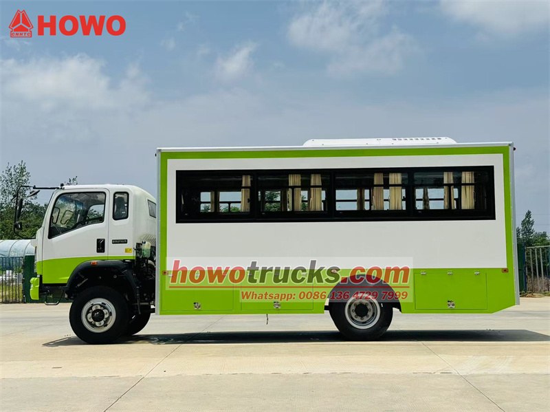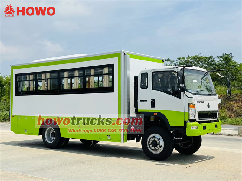 Внедорожный грузовик HOWO 4x4, предназначенный для перевозки войск, создан на базе шасси легкого полноприводного грузовика HOWO. Он имеет полукабину на 2080 рядов сидений, колесную базу 3800 мм и оснащен двигателем Yuchai YC4E140-33 и коробкой передач WLY6TS55. Верхняя часть представляет собой отсек для перевозки войск с 22 сиденьями, прозрачными окнами и шторками с обеих сторон, а также задней дверью с окном для входа и выхода. Багажные полки установлены над сиденьями и расположены по обеим сторонам отсека. Отсек оборудован кондиционером и освещением, а в нижней части по бокам установлены ящики для инструментов.