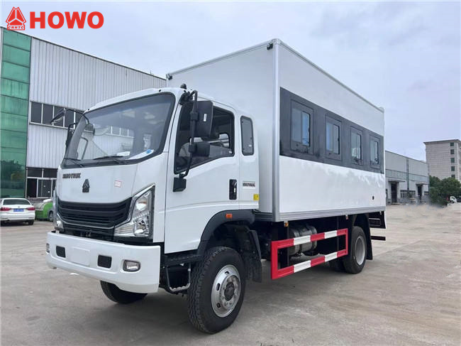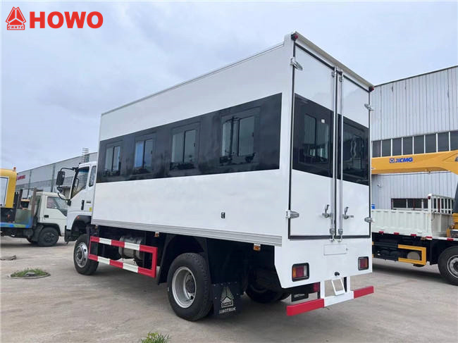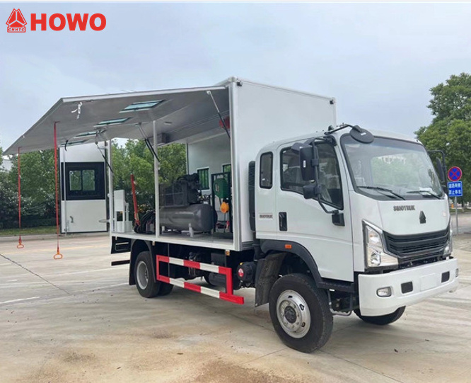 Мобильный ремонтный автомобиль HOWO 4x4 имеет следующую конфигурацию: однорядная кабина HOWO 1880, колесная база 3360 мм, двигатель Weichai WP3NQ140E50, коробка передач WLY6G120, грузовой отсек размером 4200*2100*2000 мм, правая боковая панель с размахом крыльев и телескопической опорой, окна, днище из алюминиевого сплава, внутреннее освещение и инструменты для технического обслуживания, включая воздушный компрессор, генератор, изготовленные на заказ полки, гидравлический складной стреловой кран, инструментальный шкаф, заправочная станция.машина с заправочным соплом и 10-метровой катушкой для маслопровода, лестница, кислородные баллоны, ацетиленовые баллоны, аппараты для газоструйной и гидравлической сварки,Ручная дисковая шлифовальная машинадва огнетушителя и т. д.