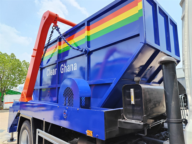 Мусоровоз Howo 6x4 с системой погрузки/разгрузки типа «ролл-он-ролл-офф» оснащен прочной платформой толщиной 8 мм, мощными поворотными рычагами для подъема и опускания контейнеров большой грузоподъемности. В задней части платформы установлен гидравлический крюк, который позволяет блокировать и разблокировать контейнер, обеспечивая возможность его опускания на землю для сбора мусора в фиксированном месте; также он может использоваться для выгрузки мусора на мусороперерабатывающих станциях. Для повышения эффективности и удобства использования предусмотрены как ручной гидравлический клапан, так и электрический блок управления.