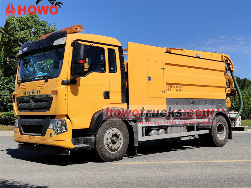 Комбинированная машина для гидроструйной очистки HOWO 4x2 объемом 11 куб. м построена на шасси HOWO TX 2280 с полуторным рядом сидений, обеспечивая баланс комфорта и маневренности, что делает ее подходящей для работы в городских условиях и на сложных дорожных участках.