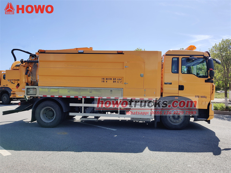 Дноуглубительный самосвал HOWO 4x2 объемом 11 куб. м модифицирован на базе шасси полуприцепа HOWO TX 2280. Он имеет колесную базу 4500 мм и оснащен двигателем Sinotruk MC07.31-60 и 6-ступенчатой коробкой передач. Он оборудован резервуаром для сточных вод объемом 6,7 куб. м и резервуаром для чистой воды объемом 4,2 куб. м, изготовленными из углеродистой стали толщиной 5 мм. С обеих сторон корпуса резервуара расположены ящики для инструментов, а с одной стороны — блок управления, барабан для откидного борта, сливной клапан, лестница, смотровое окно и т. д. Он также оснащен вакуумным насосом Jurop PVT400 и насосом высокого давления 3N2-SZ.
