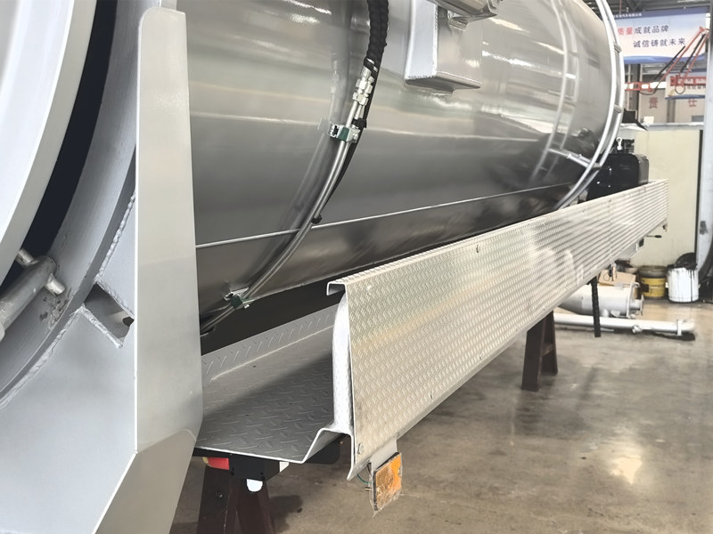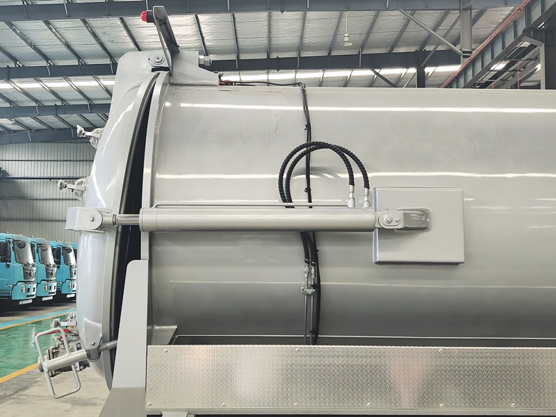 ●Транспортное средство оборудовано гидравлической системой опрокидывания, которая наклоняет весь резервуар для тщательной выгрузки и промывки, уменьшая количество остатков и поддерживая чистоту внутри. Весь процесс герметичен, что предотвращает вторичное загрязнение и распространение запахов, обеспечивая чистую и гигиеничную рабочую среду.