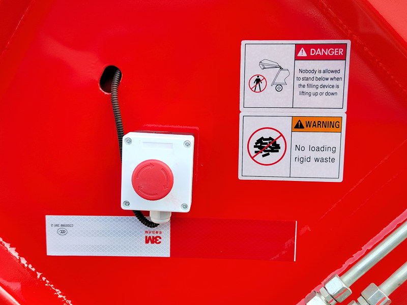 ►Специально разработанная кнопка аварийного тормоза позволяет остановить механизм уплотнения отходов в любом состоянии или положении, обеспечивая безопасность персонала и оборудования.