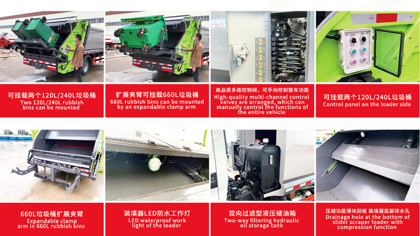 ●Простота в использовании: Автоматическое погрузочное устройство в задней части машины позволяет быстро выполнять подъем, измельчение и уплотнение отходов, экономя время и трудозатраты.